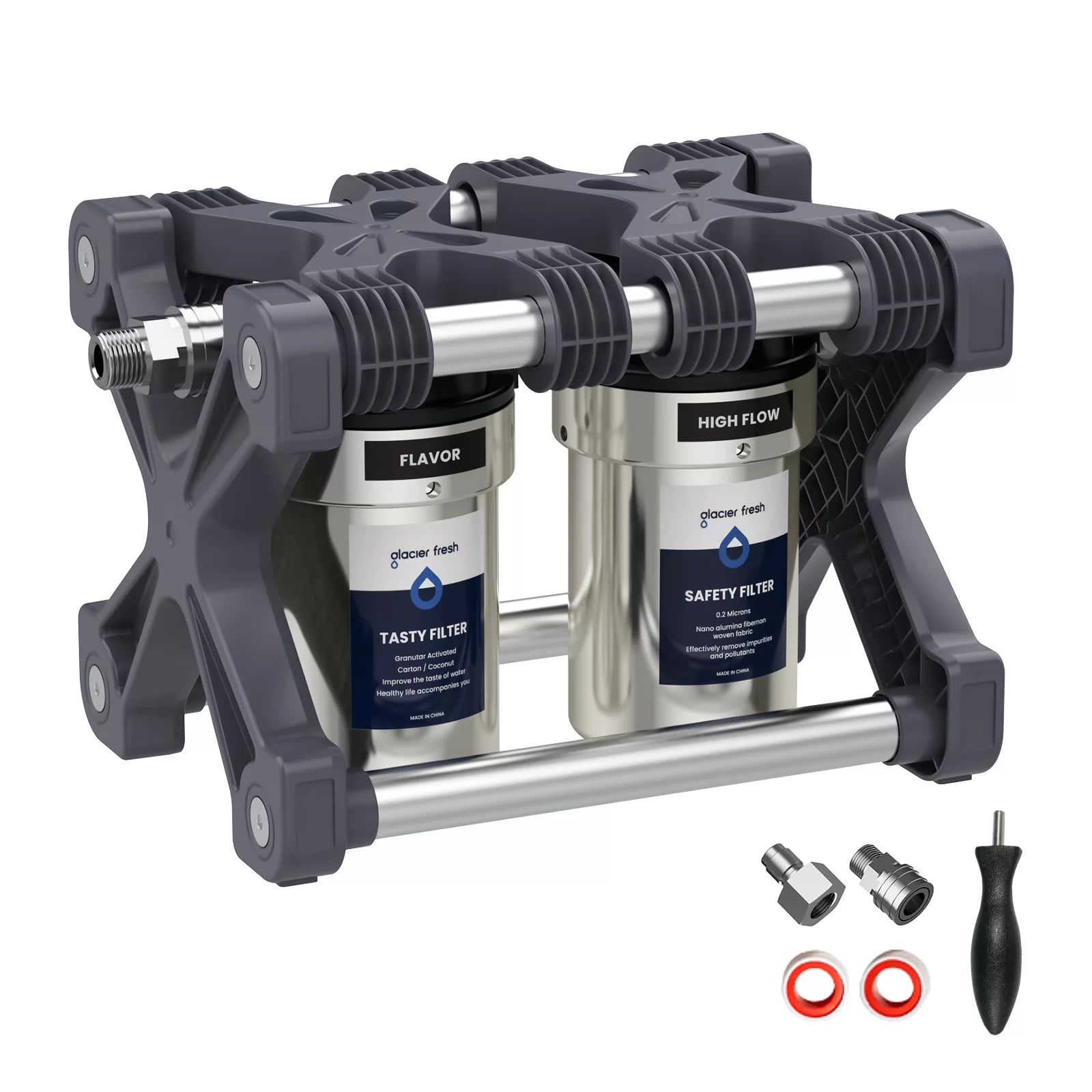 Trusted Product: 2-stage water filtration features the 0.2-micron high flow filter by Glacierfresh, improve the water taste outdoors.
