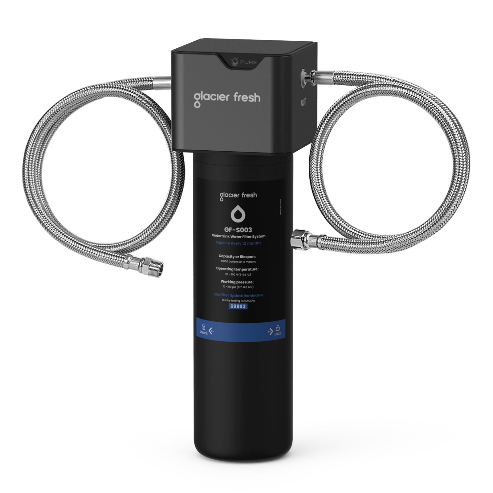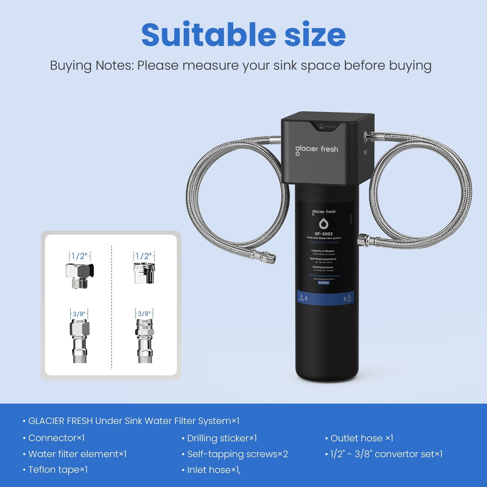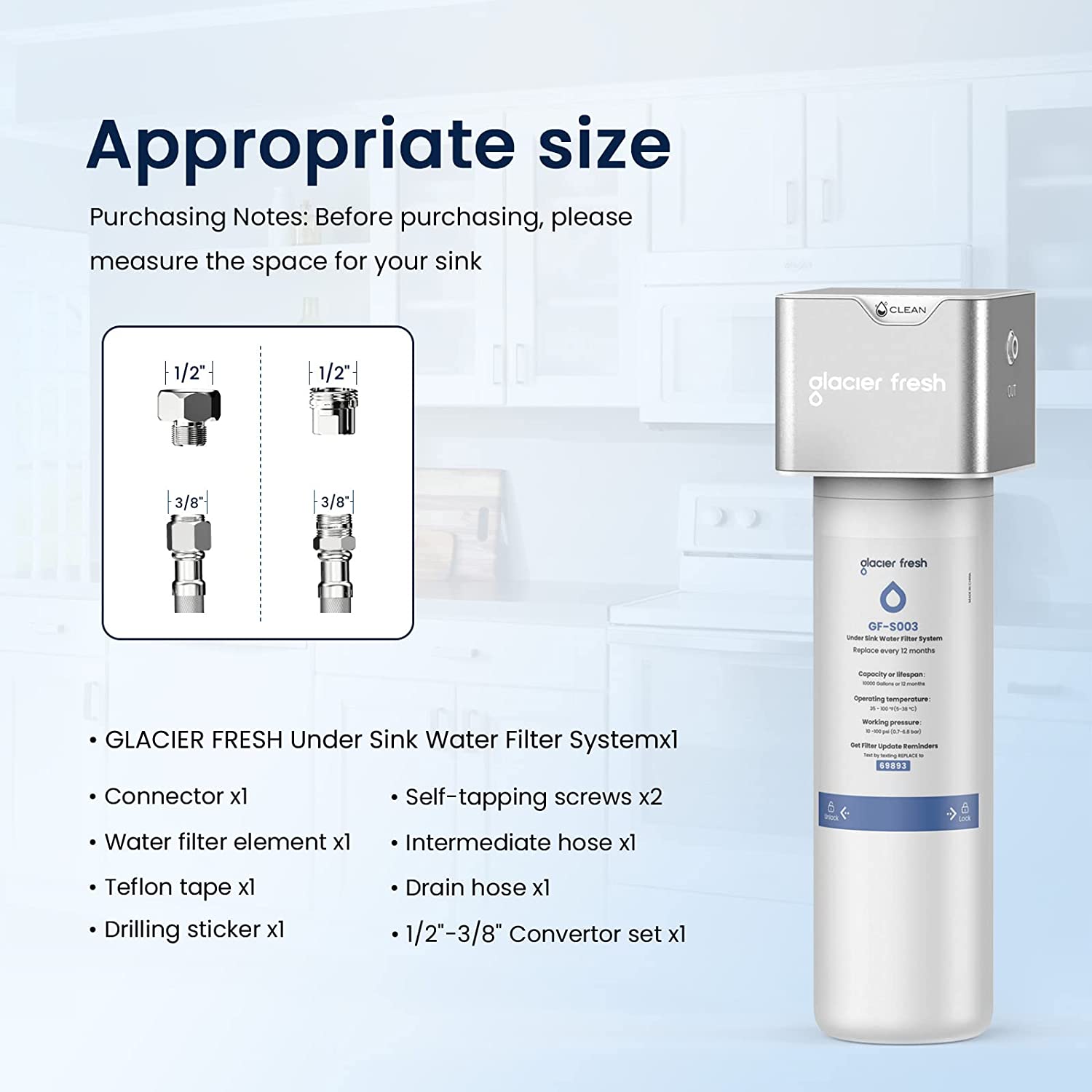 Safe Materials: GLACIER FRESH Under Sink Water Filter System is made from advanced coconut shell activated carbon with strong adsorption capacity with a 0.5-micron outer layer and food-grade materials, such as PP, NBR, and Stainless steel(304).