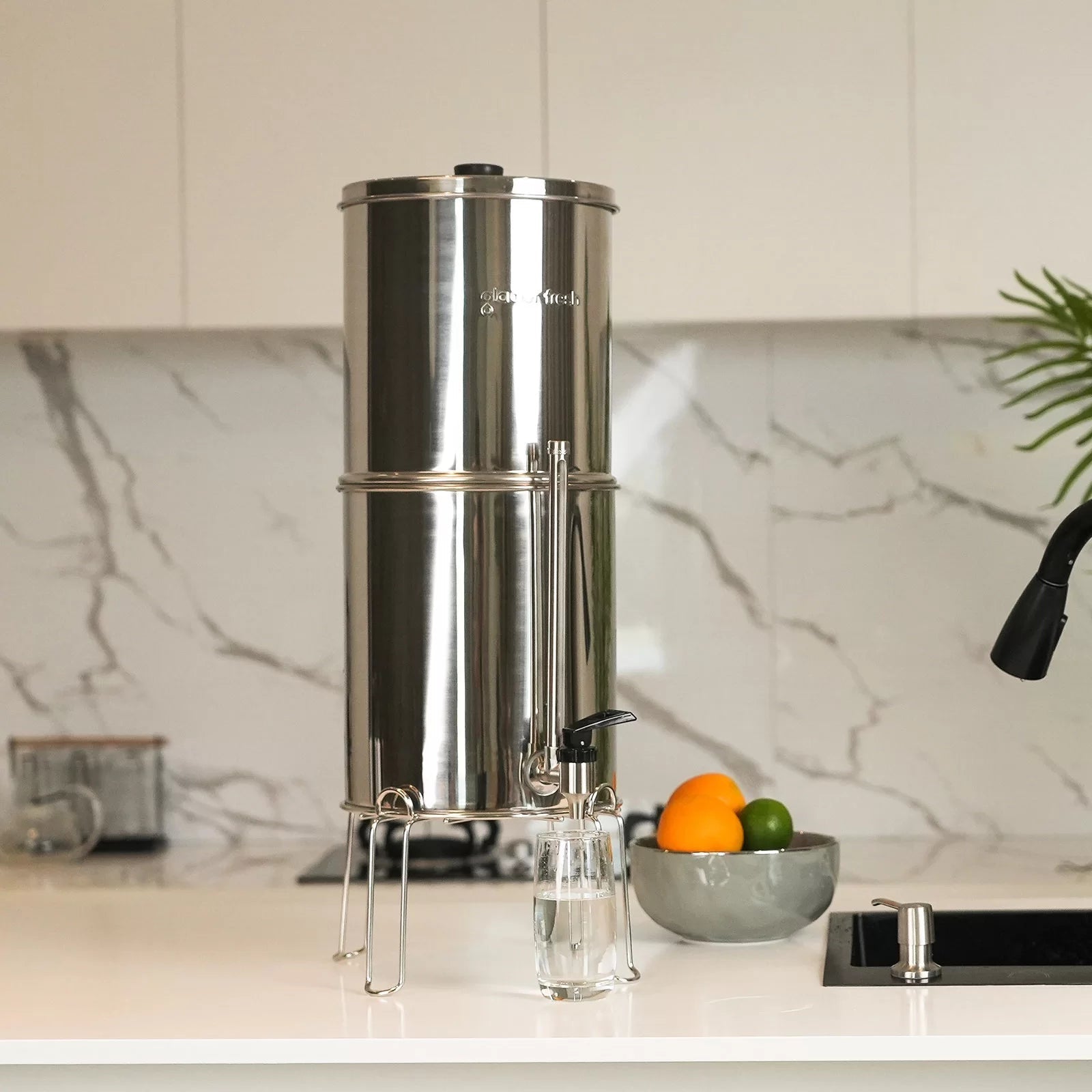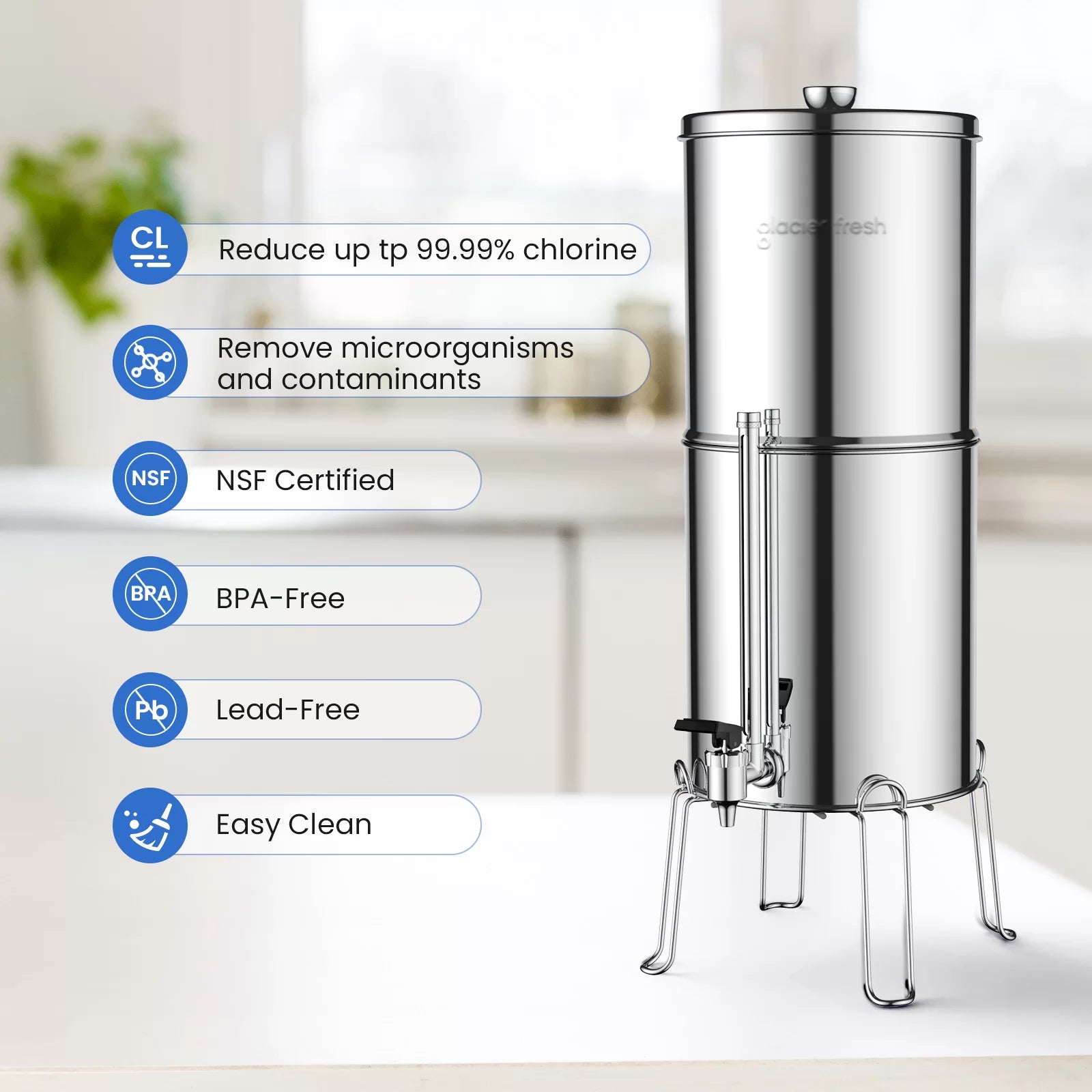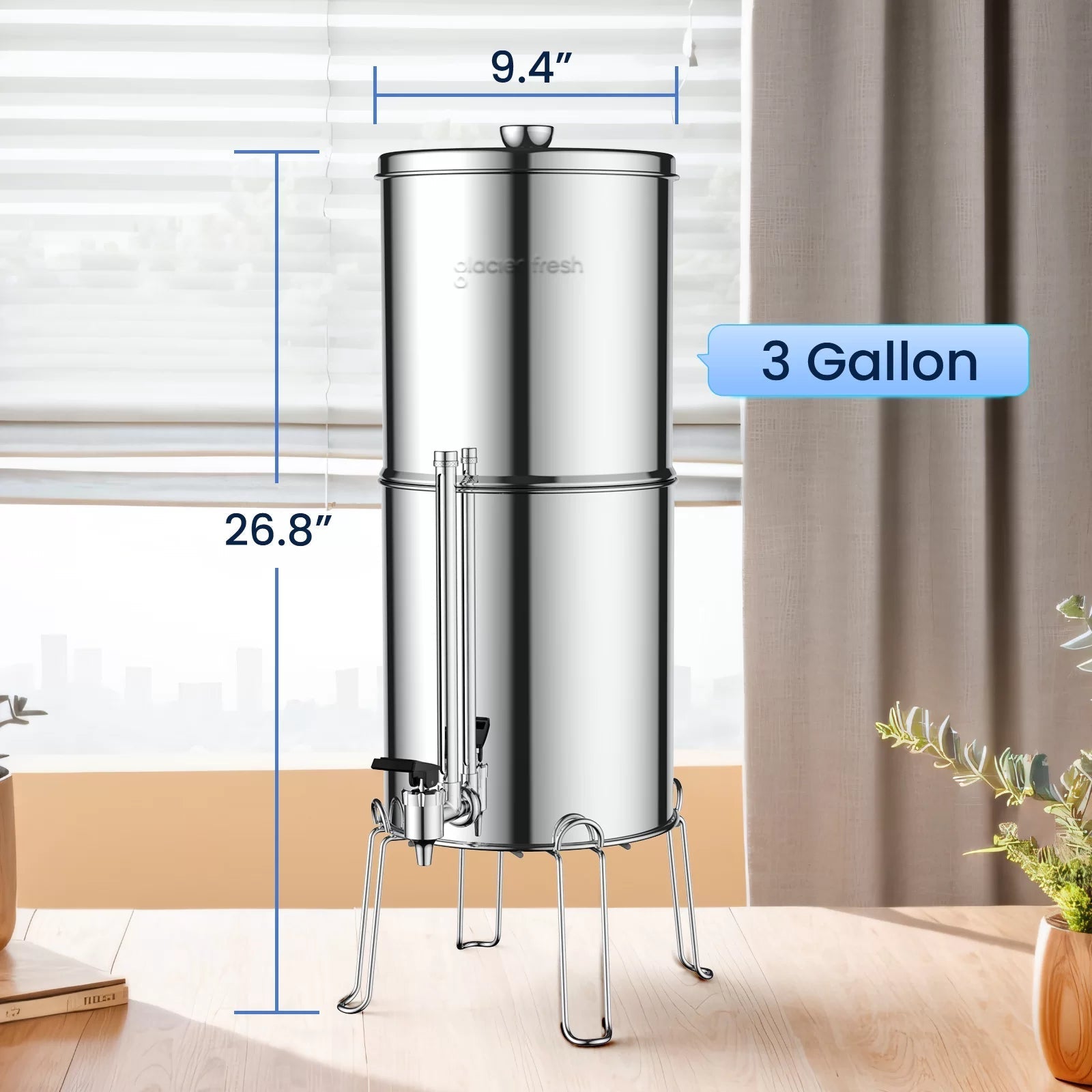 Glacier Fresh Gravity-fed Water Filter System, 3G Stainless-Steel System with 6 Filters, Metal Water Level Spigot, and Stand